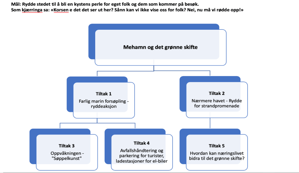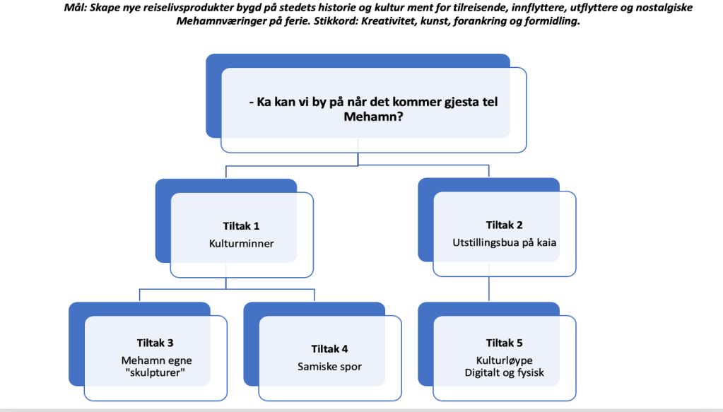 Forslag til tiltak under hvert hovedpunkt blir i tett samarbeid med folket. Tiltakene er fremdeles på overskriftsstadiet, men vil bli utformet som tiltak og aktiviteter i løpet av prosjektperioden. Nye tiltak og delprosjekter kan oppstå i løpet av prosjektperioden.