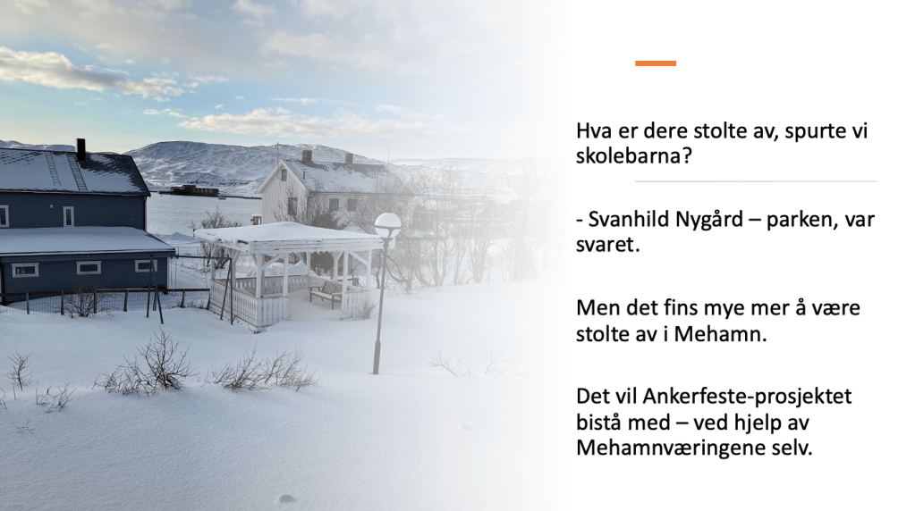 Arbeidsplasser, næringsutvikling, skole, fritids- og servicetilbud, et pent sted, kultur og historie er til sammen det som er fundamentet i Ankerfeste-prosjektet. Det hele starter i Mehamn, men hvis det blir en suksess kan det bli en ny metode for å styrke små kystsamfunn, et konsept som er overførbart til andre samfunn.