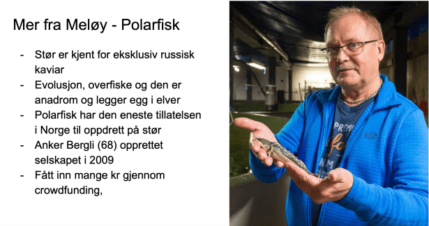 – Presentasjonen varte i ca 45 minutter, deretter hadde vi en pause med mat og så hadde gruppen en god diskusjon om hva som skal til for å skape flere arbeidsplasser og aktivitet i Mehamn. Både ordføreren og næringslivssjefen var til stede. Vi var innom temaer som akvakultur (laks, tare, kråkeboller og snegler), vindkraft og gruvedrift, forteller Emma Gunnarsson.